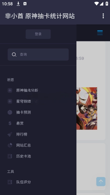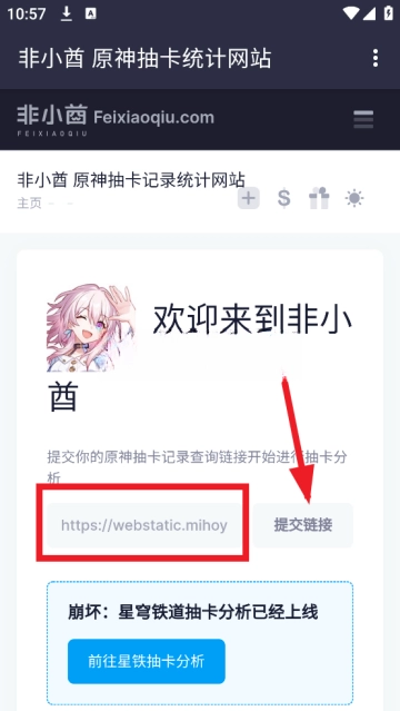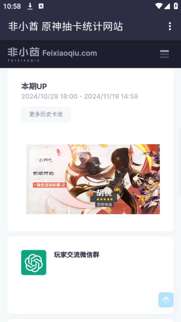 非小酋软件是一款针对原神和星铁游戏的抽卡分析辅助工具,能帮你判断自己是名副其实的非酋还是欧气爆棚。使用时只需获取连接即可进行分析,同时软件会实时告知用户当前最新的卡池角色信息。它的界面设计简洁直观,全程干扰,支持免费使用且无需登录账号。