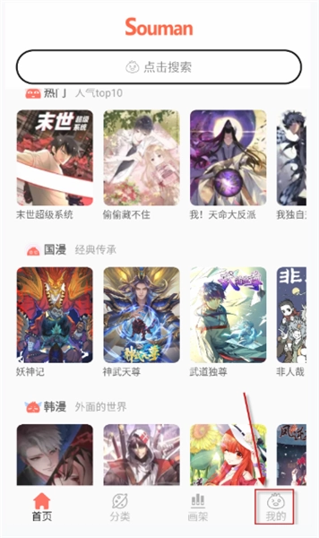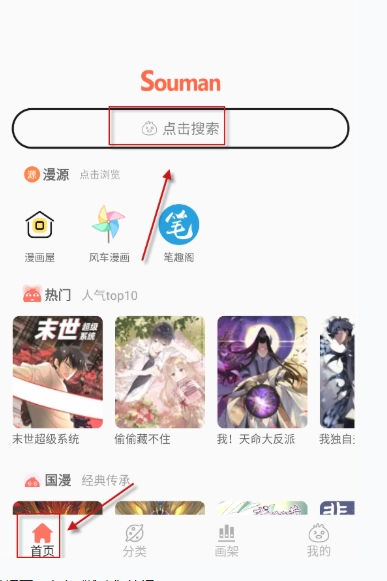 1、安装并打开souman后,在“首页”中的点击顶部的搜索栏