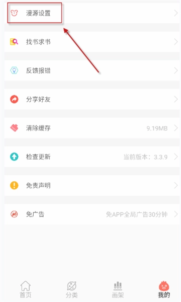 2、然后在“我的”页面中点击“漫源设置”选项
