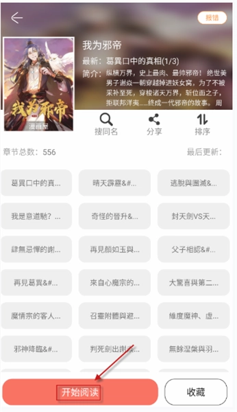 4、进入漫画详情页后,点击底部的“开始阅读”按钮就能观看漫画,也可以对漫画进行收藏操作。