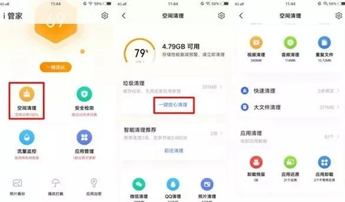 对于这个功能相信大家都用过不少次了,每当我们的手机内存不是很够用,或者在使用手机的时候觉得有些卡顿时,不少小伙伴都会选择进行空间清理。在空间扫描完成以后,我们既可以选择一键简单清理,也可以利用其中提供的其他清理工具对手机进行内存清理,一般都能清出几个G的内存哟。