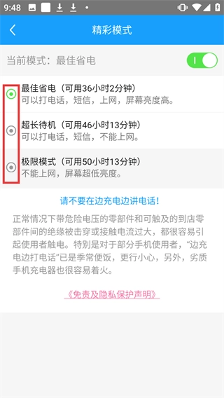 4、在精彩模式中可选择【最佳省电】【超长待机】【极限模式】等,点击对应选项即可切换模式。