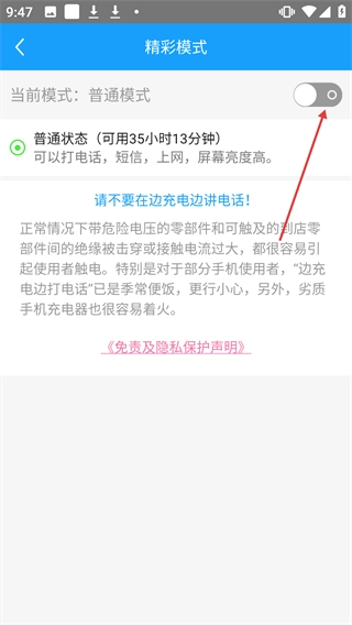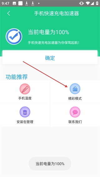2、在手机快速充电加速器界面点击【精彩模式】可进入模式设置页面。