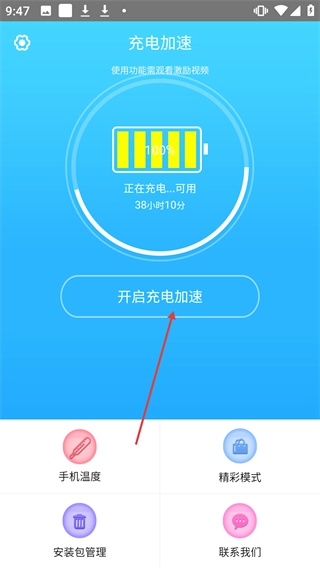 1、点击【开启充电加速】按钮,观看激励视频后即可启用充电加速功能。
