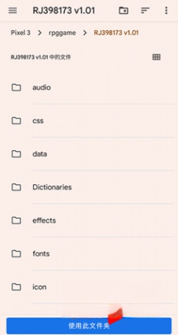 3、找到刚刚解压的游戏目录,点击下方的“使用本目录文件”来添加游戏(若游戏非RPGMakerMV制作,系统会弹出提示)。