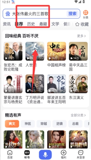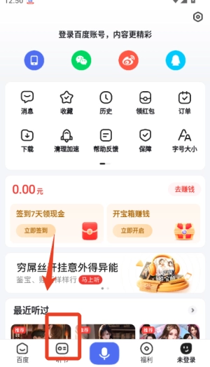 1、打开百度畅听版首页,点击底部“听书”频道,选择喜欢的小说或评书开始播放。