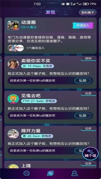 2、圈子加入:可自由在线查找圈子并加入,便于能同时和诸多网友聊天互动;