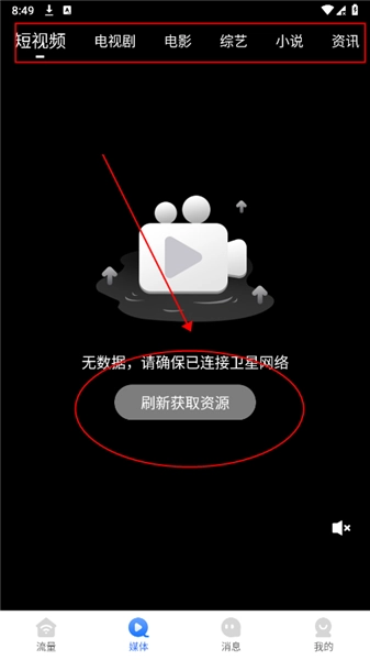 2、首页可以看到短视频、电视剧、电影、综艺、小说、资讯等栏目,但是提示无数据,请确保已连接卫星网络;