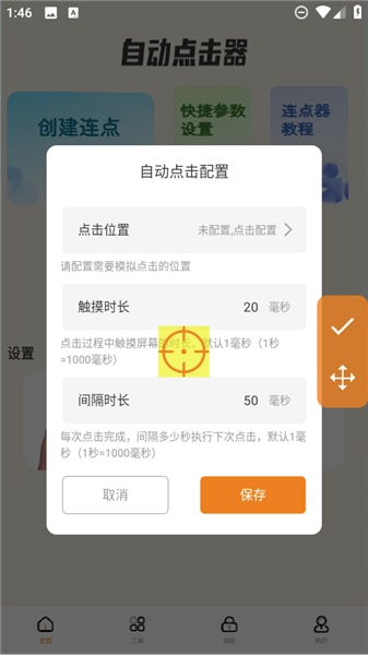 3、接着设置好点击位置,触摸时长,间隔时长等相关参数,点击【保存】。