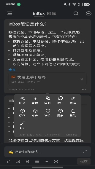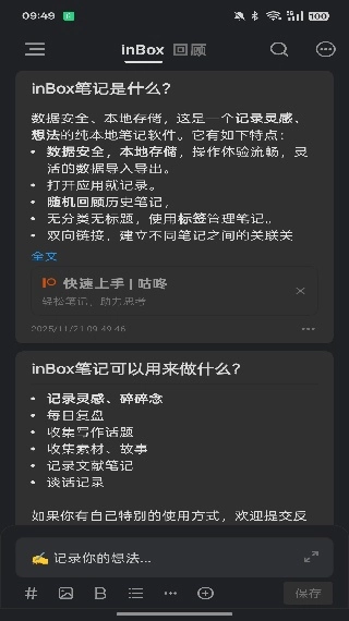 inBox笔记是一款主打本地存储的卡片笔记软件,支持个人云盘同步和智能笔记功能。它将数据存储在本地,操作流畅、启动快捷,同时通过本地加密与网盘备份的双重保障,确保了数据的安全性。
