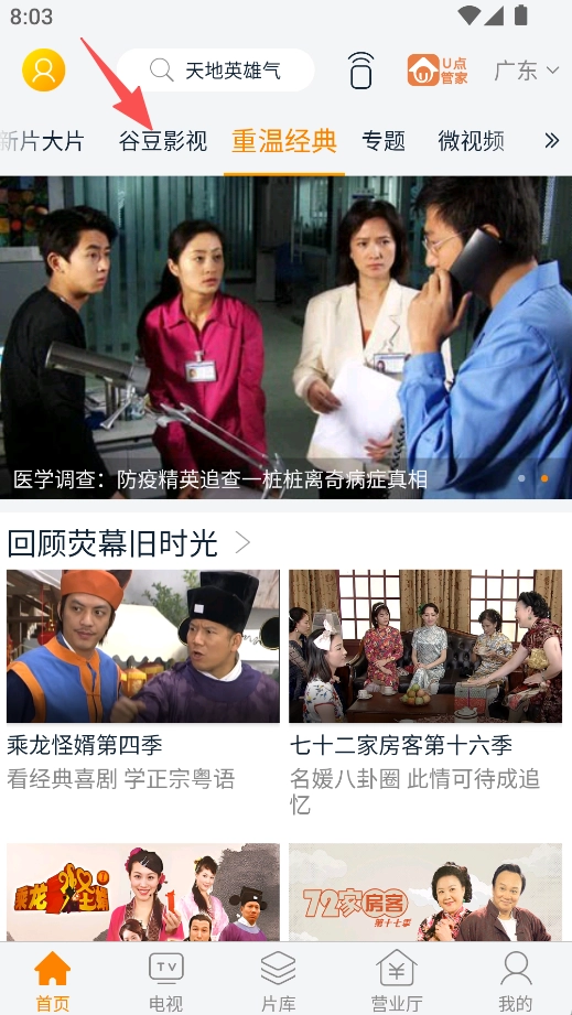2、在首页中找到并点击“谷豆影视”或“重温经典”。