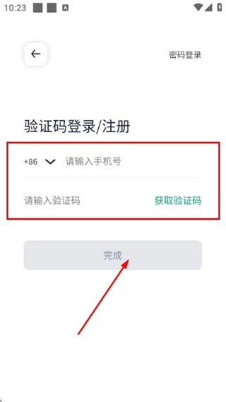 3、在验证码登录页面填写手机号和验证码,勾选协议后,点击完成即可登录。