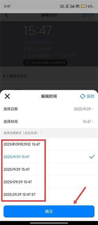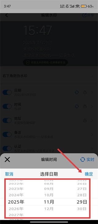 3、在【自定义水印相机】编辑时间页选择目标日期,点击【确定】按钮哦。