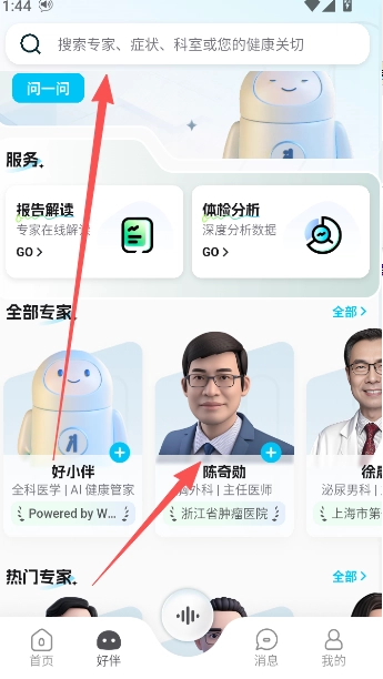 1、您可以在搜索栏输入想问诊的专家姓名、具体症状名称、关注的健康问题,也能依据专业推荐进行选择。