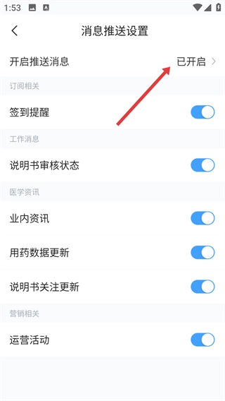 3、在消息推送设置页,点击【开启推送消息】进入详情页面。