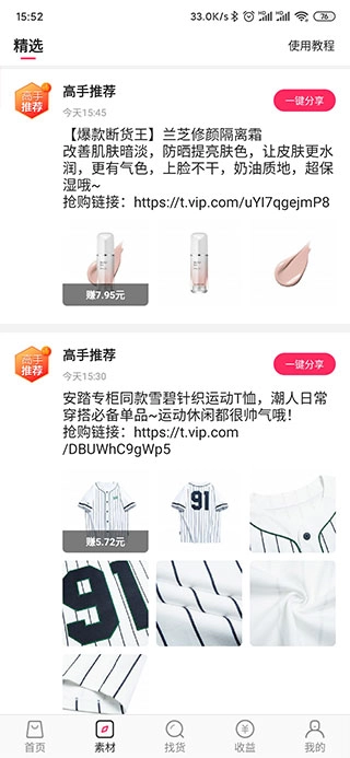 2、然后你会看到5个板块分别为首页、素材,找货、收收益、我的,点开首页这里有大量的商品供用户选择及分享。