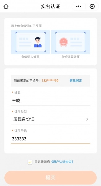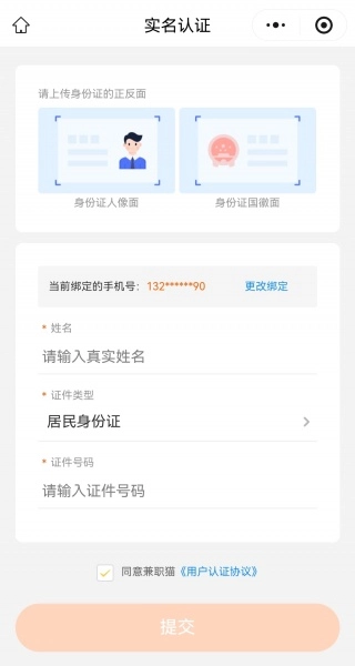 3、上传身份证正反面的照片,输入真实姓名和证件号码,点击提交就可以了。之后根据指引继续操作即可。