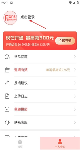 2、在个人中心页面,看到点击登录提示,点击该区域,进入软件的登录选择界面。