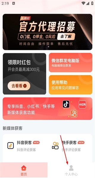 1、进入微商大师软件首页后,能够使用新媒体获客等功能,点击底部的个人中心选项,即可进入与个人相关的页面。