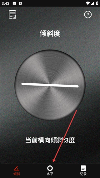 1、在【倾斜度】页面查看【当前横向倾斜:3度】的数值,可切换至底部的【水平】选项以进入水平校准环节。