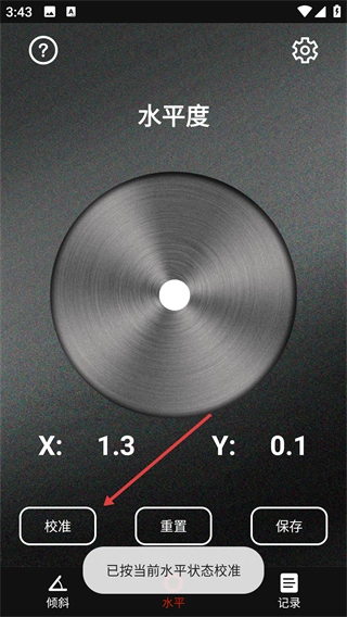 2、进入【水平度】页面后,点击【校准】按钮可按当前状态校准水平,校准后可通过【保存】记录设置。