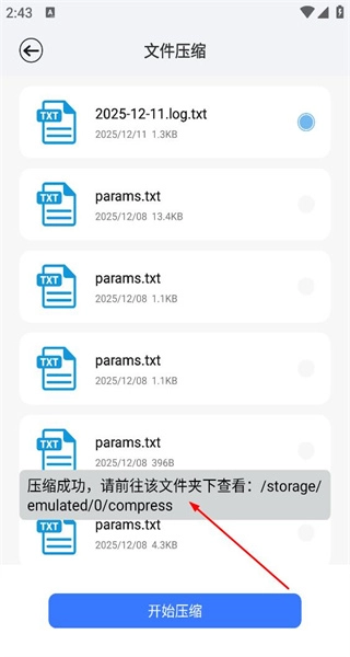 打开软件后,先查看手机的存储空间信息,接着找到文档压缩的选项,点击该选项就能进入对应的文件选择页面。