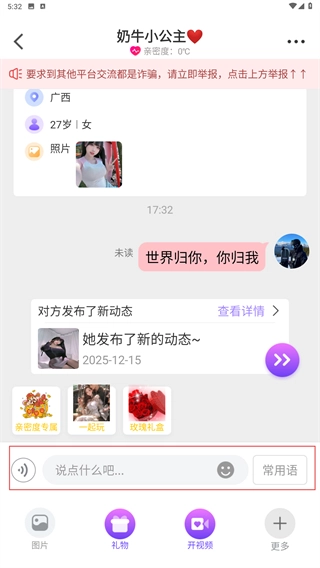 3、在聊天界面,点击【说点什么】输入框,输入内容即可与对方实时互动交流。