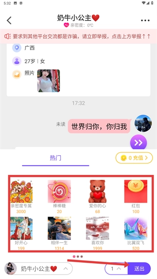 4、在聊天界面下方选择【粉色专属】-【棒棒糖】等礼物,点击送出可增加互动趣味性。