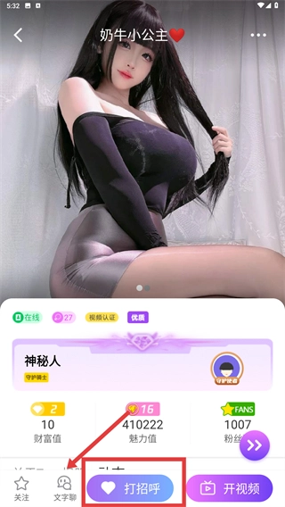 2、进入【奶牛小公主】主页后,点击【打招呼】按钮,可快速发起与该用户的互动交流。