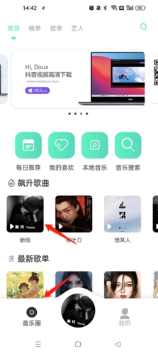 1、打开软件,点击“音乐圈”选项,然后点击“音乐搜索”选项。