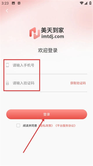2、在登录界面,依次输入手机号码、点击【获取验证码】并填写收到的验证码,勾选协议后点击【登录】按钮,即可完成账号登录。