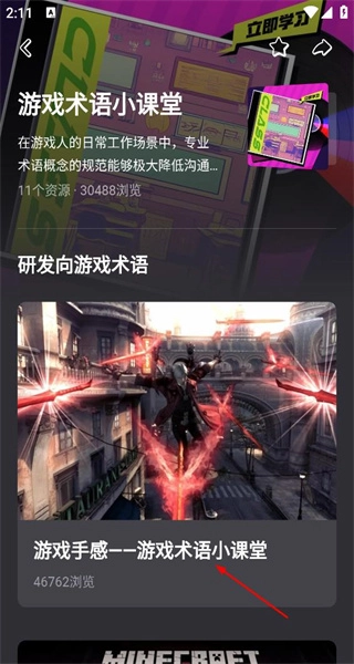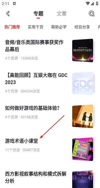 2、在专题页面,选择游戏术语小课堂内容,点击进入该课程的详细内容列表界面。