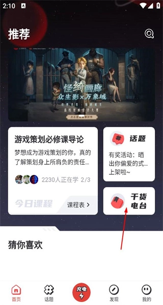 1、打开软件首页后,能看到推荐课程,点击“干货电台”选项,即可进入专题内容的浏览页面。