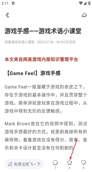 4、进入游戏手感详情页,查看内容介绍,了解游戏手感的定义及相关分析内容。