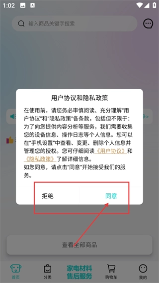 1、仔细阅读【用户协议】和【隐私政策】后,点击【同意】按钮,就能进入应用使用商品搜索、售后服务等各项功能。