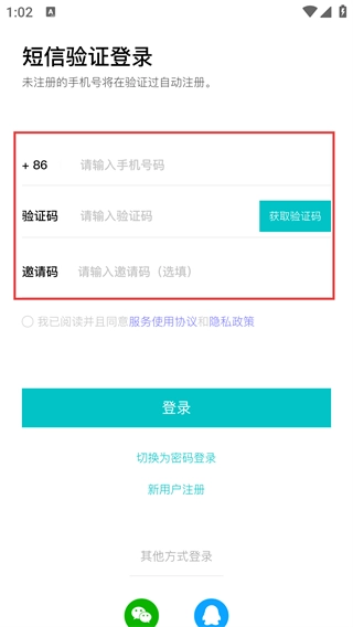 3、选择【短信验证登录】,输入手机号码并点击【获取验证码】,填写验证码(邀请码选填),点击【登录】。