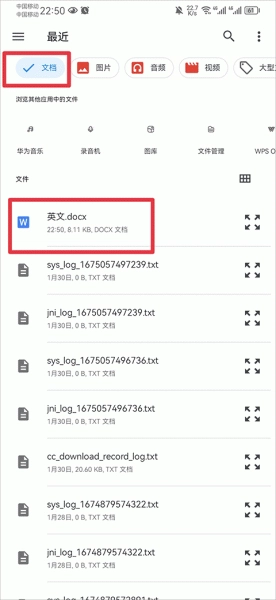 3、然后手机文件中点击文档,并在文档界面中选择你要上传的文档
