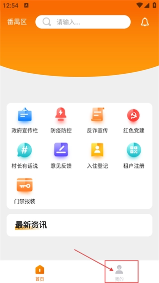 1、点击首页底部的【我的】入口,即可进入个人中心页面;首页还设有【政府宣传栏】【防疫防控】等社区服务类功能板块。