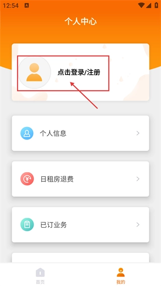 2、进入个人中心后,点击【点击登录/注册】按钮,即可进入登录界面,登录后可管理【个人信息】【已订业务】等内容。