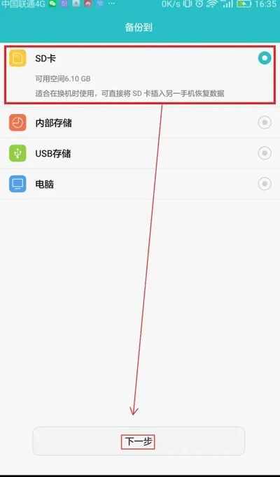备份路径一般有SD卡、内部存储、USB存储及电脑,用户可根据需要选择,这里我们选择SD卡,并单击“下一步”