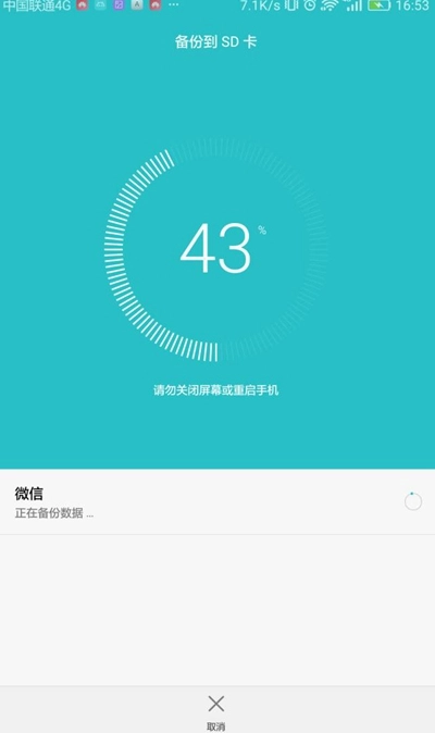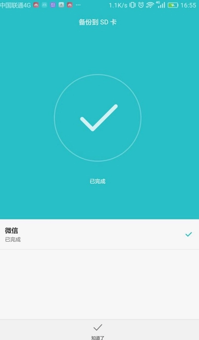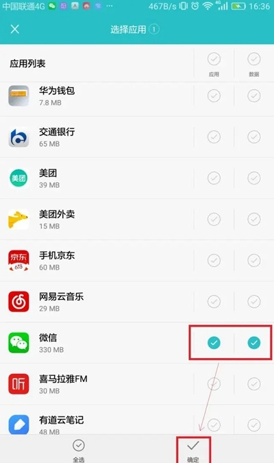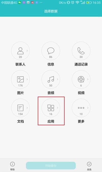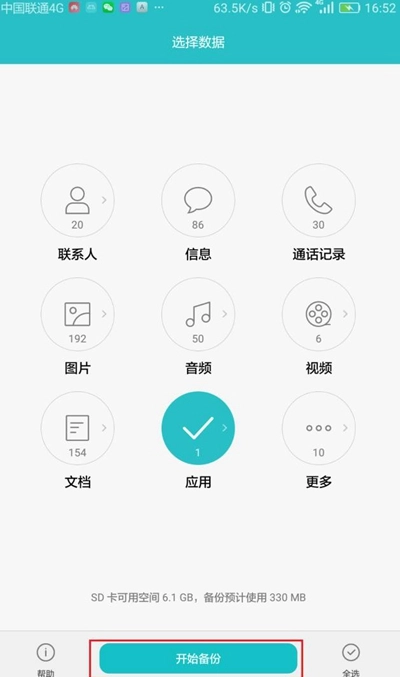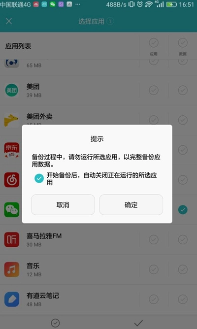 用户可以根据需要选择备份需要的数据,此处我们选择备份微信,单击“应用”