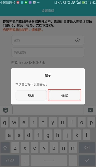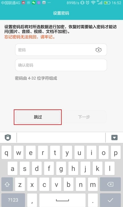 单击“开始备份”后会弹出“设置密码”项,此处选择“跳过”