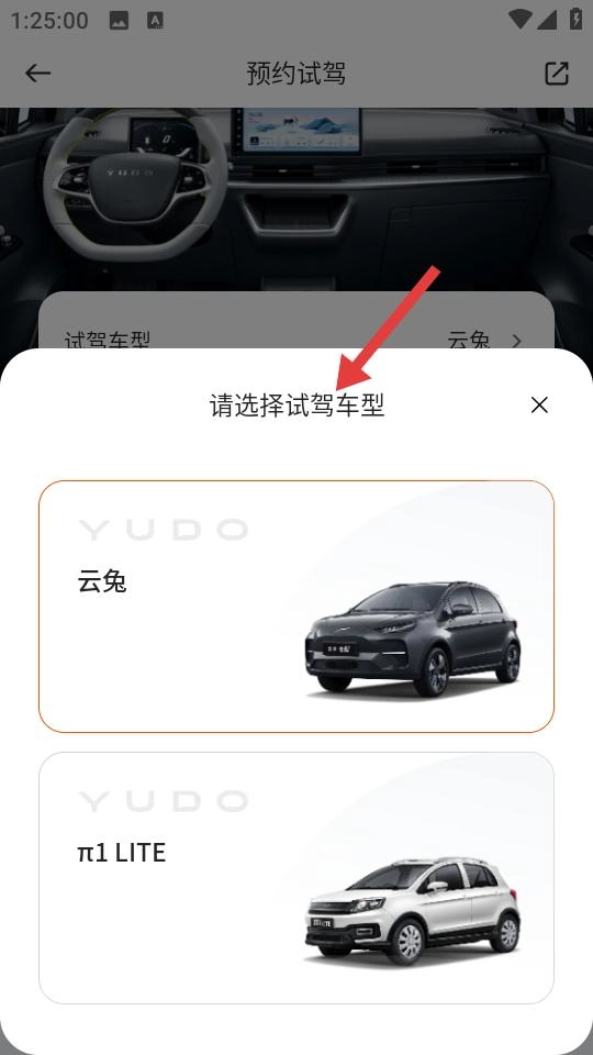 2、预约试驾时弹出车型选择框,展示云兔、π1LITE两款车型,图文并茂呈现外观,用户按需点选,确定试驾车辆,为线下体验做精准匹配。