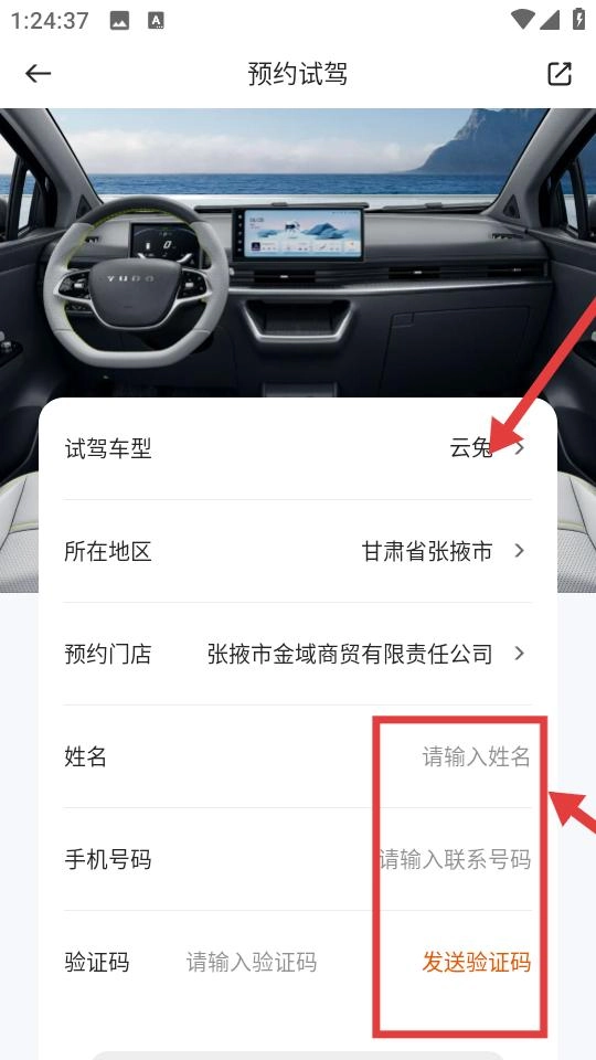 3、预约试驾页呈现车辆内饰,需依次选车型、地区、门店,填写姓名、手机号、验证码,每步清晰引导,助力用户提交试驾申请,感受实车性能。