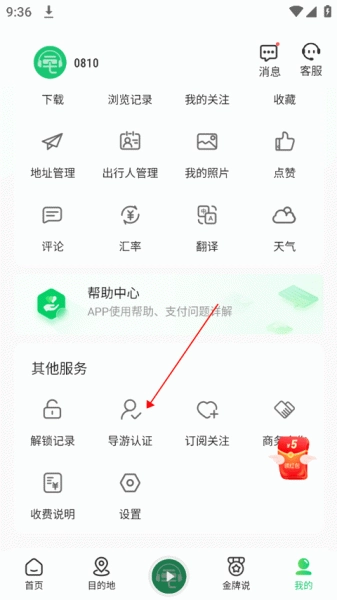 1、先打开软件完成注册与登录,接着点击底部的【我的】选项,然后向下滑动页面至底部,找到并点击【导游认证】按钮。