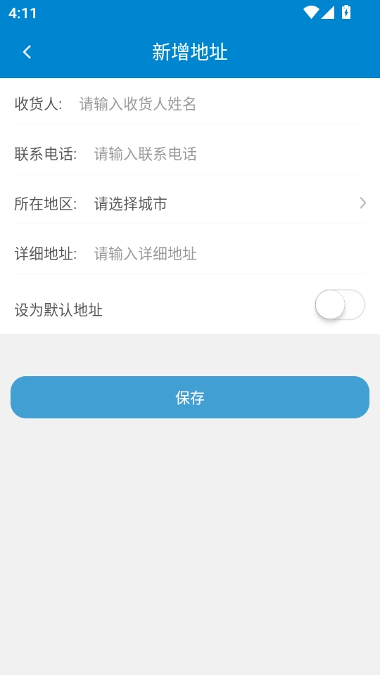 4.最后大家在“新增地址”界面,输入收货人、联系电话、所在地区、详情地址后,点击“保存”按钮就完成了。