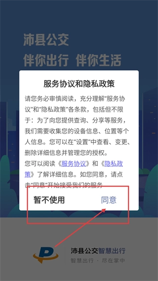 1、进入【沛县公交】后,需阅读【服务协议】与【隐私政策】,点击弹窗里的【同意】按钮,方可继续使用其出行服务。