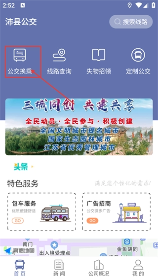 2、进入【沛县公交】首页,可点击【公交换乘】功能,同时还有【线路查询】-【失物招领】等服务入口,可按需选择功能使用。