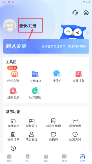 2、在个人中心页面,点击登录/注册选项,进入登录方式选择界面。