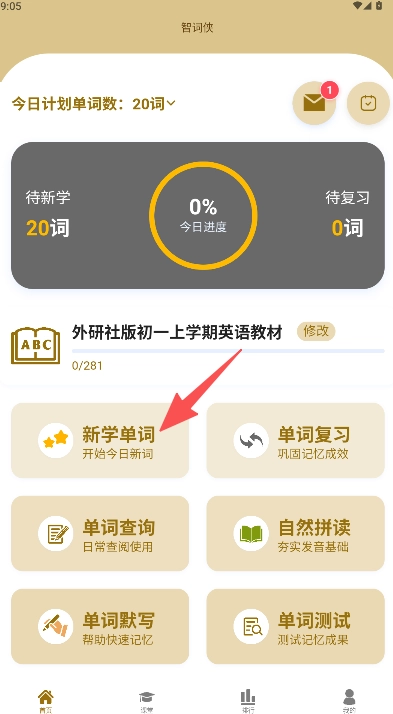 1、在主界面中明确标示出“新学单词”按钮的位置。